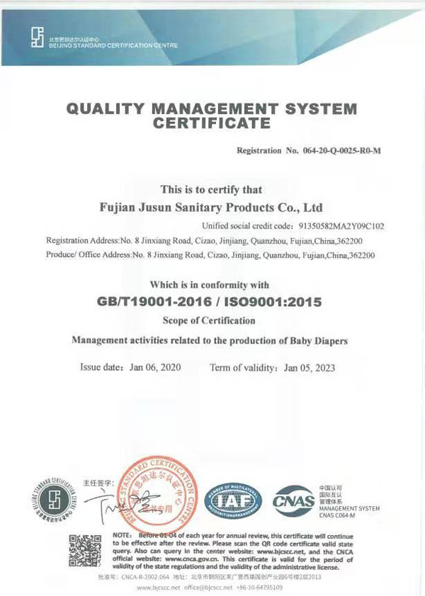 福建巨森衛生用品有限公司于2017年初成立(原廠南昌巨森實業發展有限公司創立于2012年)。公司擁有一批高學歷、高素質的管理骨干和敬業的生產團隊,以專業的技術、嚴謹的管理、優良的設備、穩定的貨源與強大的生產實力,為許多的客戶和代理商提供了優質的產品與服務,得到了廣大客戶的信任與肯定。如今產品已經覆蓋全國各地多個省、自治區、直轄市。在不斷擴展業務的同時,我們也致力于供應鏈從源頭管控,有效地保證整個生產環節的安全與衛生。2020年公司通過了ISO9001質量體系認證等在內的8大國家及世界級權威機構認證,部分品牌還通過了醫護級產品認證,產品質量邁向了新的高度。品質鑄就企業,誠信鑄就實力。