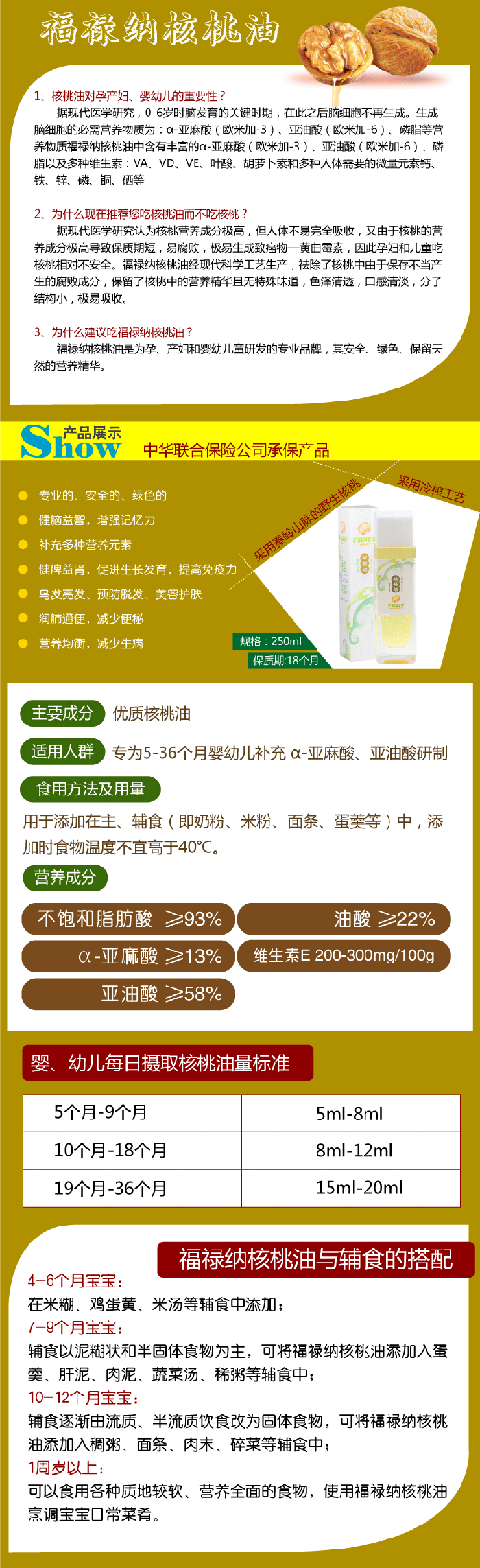據(jù)現(xiàn)代醫(yī)學(xué)研究認(rèn)為核桃營養(yǎng)成分極高,但人體不易完全吸收,又由于核桃的營養(yǎng)成分極高導(dǎo)致保質(zhì)期短,易腐敗,極易生成致癌物—黃曲霉素,因此孕婦和兒童吃核桃相對不安全。福祿納核桃油經(jīng)現(xiàn)代科學(xué)工藝生產(chǎn),祛除了核桃中由于保存不當(dāng)產(chǎn)生的腐敗成分,保留了核桃中的營養(yǎng)精華且無特殊味道,色澤清透,口感清淡,分子結(jié)構(gòu)小,極易吸收。