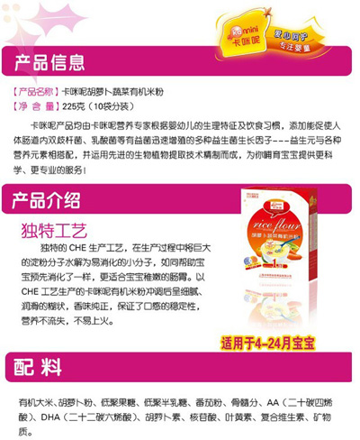 卡咪呢有機米粉系列是專為中國寶寶設計的營養(yǎng)輔食,選用有機大米,科學搭配維生素AD等維生素,還特別添加牛磺酸、DHA、AA等有助智力發(fā)育的營養(yǎng)成分,富含15種營養(yǎng)素。現上海卡咪呢母嬰用品有限公司面向全國空白市場區(qū)域誠招卡咪呢有機米粉代理商。