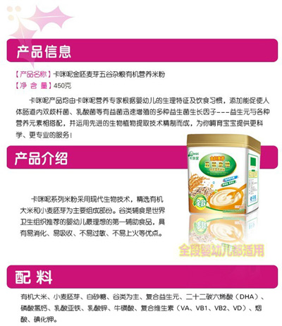 您所在位置:首頁>上海卡咪呢母嬰用品有限公司>卡咪呢金胚麥芽五谷雜糧有機營養米粉