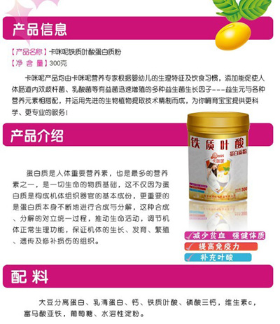 您所在位置:首頁>上海卡咪呢母嬰用品有限公司>卡咪呢鐵質葉酸蛋白質粉