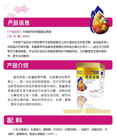 蛋白質是人體重要營養素,也是多的營養素之一,是一切生命的物質基礎,可以保證機體的生長、發育、繁殖、遺傳及修補損傷的組織。上海卡咪呢母嬰用品有限公司是專業的母嬰營養品企業,針對中國孕嬰童體質推出了卡咪呢蛋白質粉系列產品,現面向全國招商。