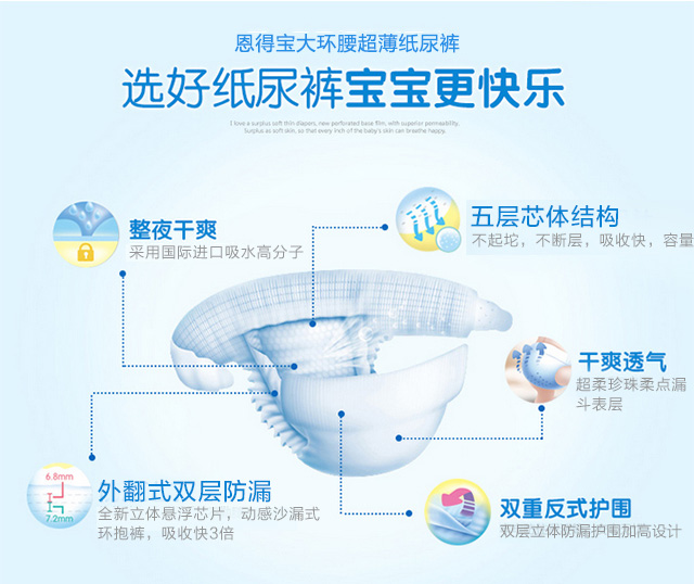 恩得寶,廣州市漢能衛生用品有限公司斥巨資打造的嬰童高端平價親民紙尿褲品牌,重點布局移動社交電商(微商)渠道,致力于打造成紙尿褲微商第一品牌,它有5大品牌優勢