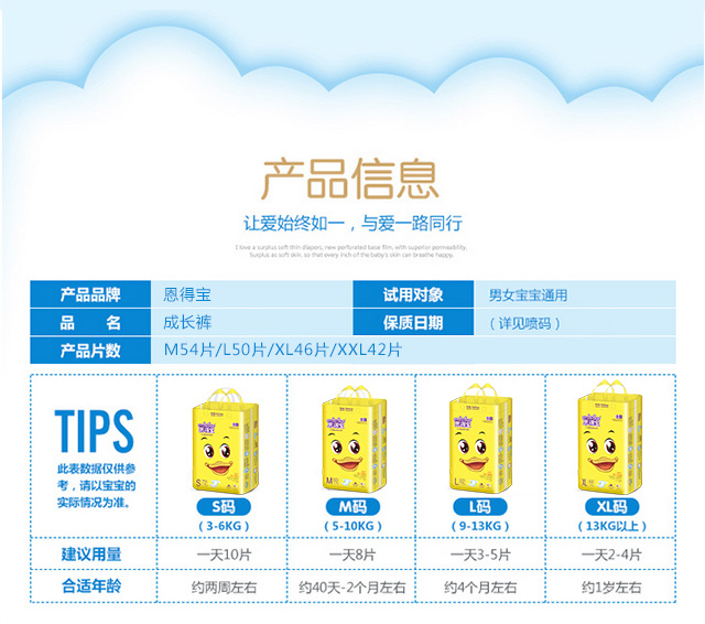 恩得寶是泉州市漢能衛生用品有限公司旗下的紙尿褲品牌,它是一家專注于紙尿褲、拉拉褲、衛生巾等產品生產加工的公司,擁有完整、科學的質量管理體系。
