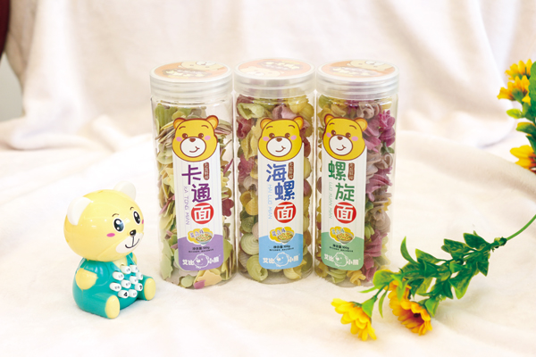 艾比小熊面條系列按造型分,有果蔬面、螺旋面、卡通面和海螺面;按口味分,有南瓜、混合、胡蘿卜、菠菜、甜菜等口味,以天然小麥粉為原料,小麥粉有著豐富的淀粉、蛋白質(zhì)、粗纖維、脂肪油、蛋白質(zhì)酶及微量元素等