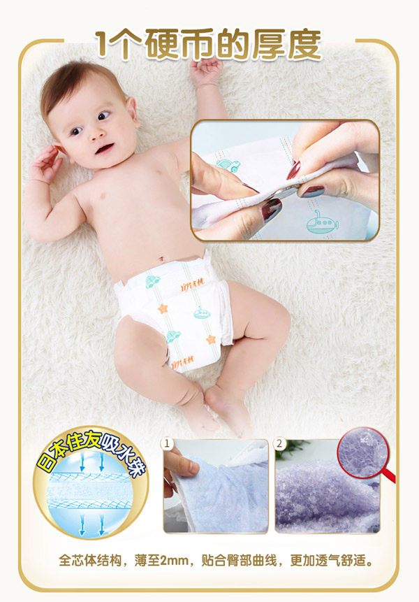 宜片無憂童趣紙尿褲采用熱風材質,親膚柔軟,選用柔軟熱風凸點無紡布作為面料,具有蓬松度高,彈性好,手感柔軟,透氣性好等特點,寶寶穿著舒適,玩的開心,睡得安心。