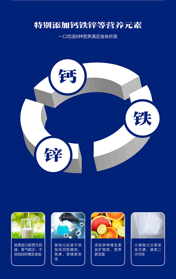 嬰標GB-10769,不添加香精、色素、防腐劑;0添加白砂糖;0添加食鹽;鈣鐵鋅強化;進口新西蘭奶油,安全健康,美味營養,好吃又好玩,相伴童年美妙時光!