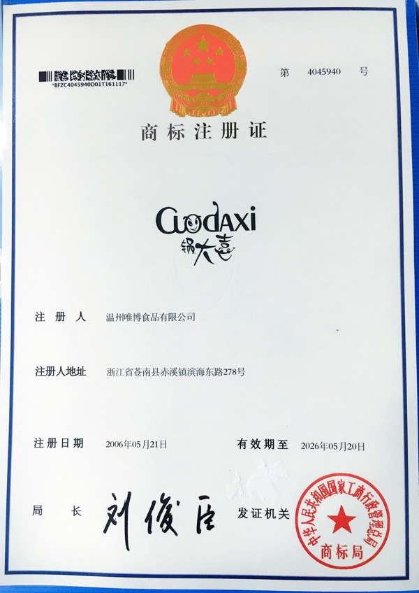 鍋大喜是溫州唯博食品有限公司旗下品牌,公司創辦于2012年,座落于享有“紫菜之鄉”美譽的蒼南縣赤溪鎮,占地面積5000多平方米,建筑面積3000多平方米,現擁有員工95人,其中專業技術人員28人。目前擁有大型淡水紫菜養殖生產基地800畝,是一家集海產品養殖、加工、銷售一條龍的企業,主導的產品有韓式香酥海苔、芝麻夾心海苔、海苔卷、壽司海苔、紫菜湯等產品。