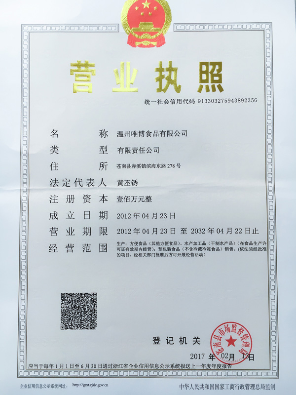 溫州唯博食品有限公司創辦于2012年,座落于享有“紫菜之鄉”美譽的蒼南縣赤溪鎮,占地面積5000多平方米,建筑面積3000多平方米,現擁有員工95人,其中專業技術人員28人。目前擁有大型淡水紫菜養殖生產基地800畝,是一家集海產品養殖、加工、銷售一條龍的企業,主導的產品有韓式香酥海苔、芝麻夾心海苔、海苔卷、壽司海苔、紫菜湯等產品。