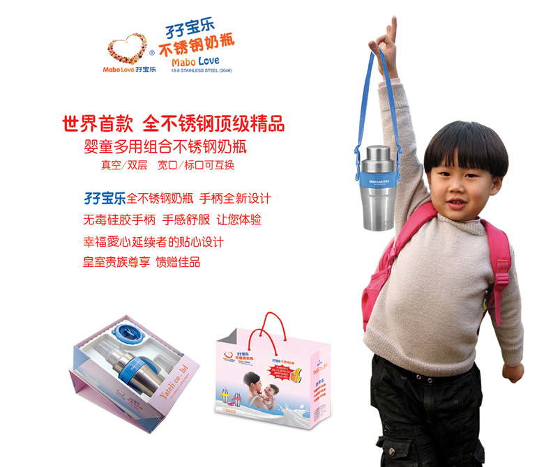 孖寶樂不銹鋼奶瓶是唯一獲得國家三項知識產權專利產品,孖寶樂就是健康奶瓶創造者,安全奶瓶領航者,幸福愛心延續者。與其它奶瓶自然形成差異化,堅信它具有非常市場潛力。