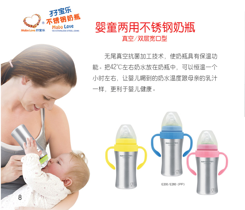 孖寶樂母嬰兩用奶瓶是專業的母嬰奶瓶品牌,產品質量優質可靠深的消費者的先來與喜愛。專業的技術,先進的科技,優質健康的pp材質,健康的不銹鋼外殼,給您和寶寶帶來專業優質的的呵護。孖寶樂雙層不銹鋼母嬰兩用奶瓶國家實用新型專利產品。新一代安全衛生無毒無不銹鋼奶瓶特別專業寶寶研制。