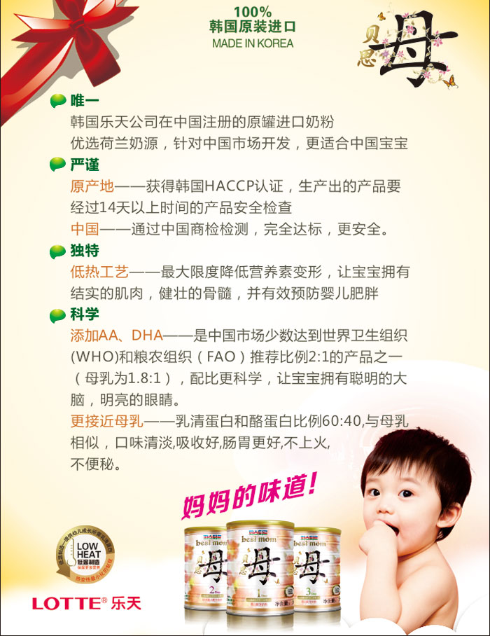 2、貝思母(韓國樂天旗下品牌)面向全國誠招代理商,歡迎加盟!如果您沒有雄厚的資金實力、沒有完善的分銷渠道、沒有優化 的營銷渠道、沒有通達的人脈網絡,只要您有共同努力的決心、創建事業的激情、永不言棄的堅持、 具備服務于大眾健康事業的 意愿,您就是貝思母永遠值得信賴的朋友!