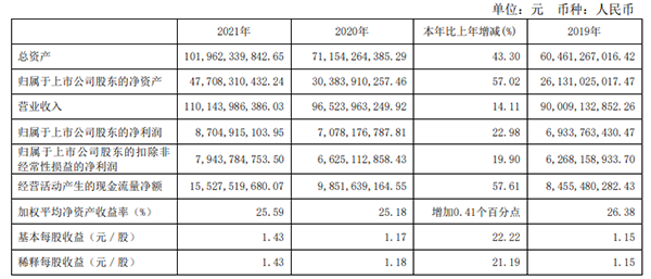 剛剛,伊利發(fā)布2021年度報告,報告期內(nèi)實(shí)現(xiàn)營業(yè)總收入 1,105.95 億元,較上年同期增長 14.15%,凈利潤 87.32 億元, 較上年同期增長 23.00%。