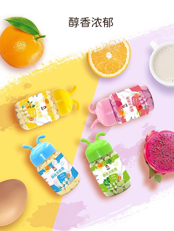 果蔬妃益生元奶泡系列有羊奶味、香橙味、火龍果味以及菠菜味四種口味,精選進口優質馬鈴薯淀粉、奶粉等優質原料,特別添加海藻糖配方,呵護消化,甜度適中,入口即化,天然美味,好吃又好玩。