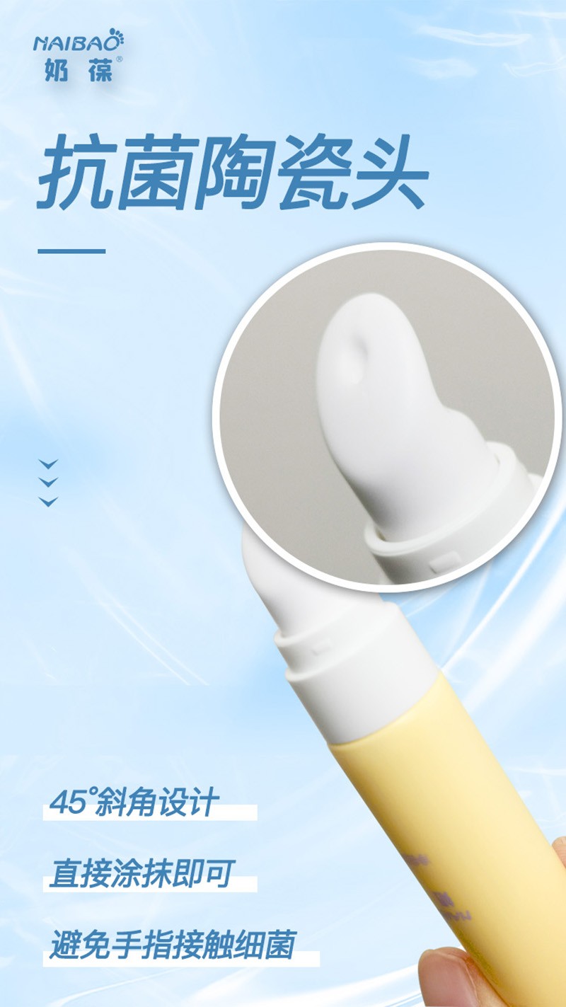 在成分選擇上,奶葆嬰兒唇周膏格外用心,特別添加紅沒藥醇、蜂蠟等成分,不僅能幫助快速成膜,還能實(shí)現(xiàn)保濕與隔離雙管齊下,為寶寶嬌嫩的唇周肌膚提供細(xì)致呵護(hù)。考慮到寶寶使用的安全性,產(chǎn)品還配備了抗菌陶瓷頭,搭配貼心的 45° 斜角設(shè)計(jì),家長無需借助手指,直接涂抹即可,有效避免手指接觸帶來的細(xì)菌干擾,讓每一次護(hù)理都安心放心。
