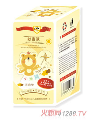 小迪熊蚊香液采用全天然植物精油配方,高品質原料,給bao--bao更安全的呵護,適合、孕婦及對一般滅蚊yaowuguomi者使用,符合國際衛生組織標準,品質有保障,在有效防蚊的同時,不會對bao--bao身體產生任何影響,是bao--bao首驅蚊產品。
