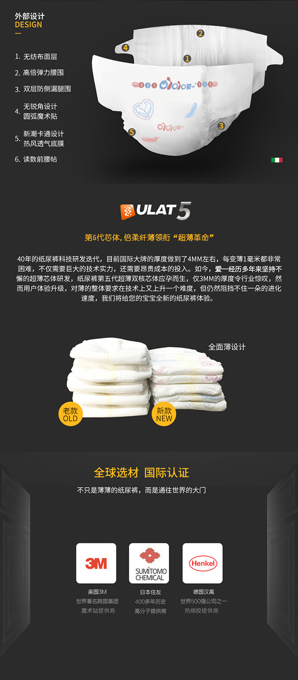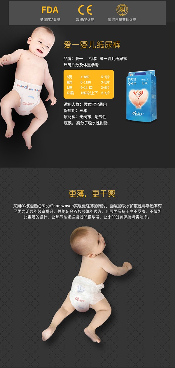 oioio愛一紙尿褲,是源自新加坡的紙尿褲品牌,品牌秉承“讓愛始終如一”的品牌理念深受廣大消費者喜愛,愛一品牌的紙尿褲是根據孩童體質及身體曲線科學立體裁剪,具備舒適綿柔,干爽透氣,高效吸收,雙重防漏等產品特點,在未來我們將不斷創新、完善,致力于為孩童提供健健康舒適的產品,給家長們提供輕松的育兒體驗。