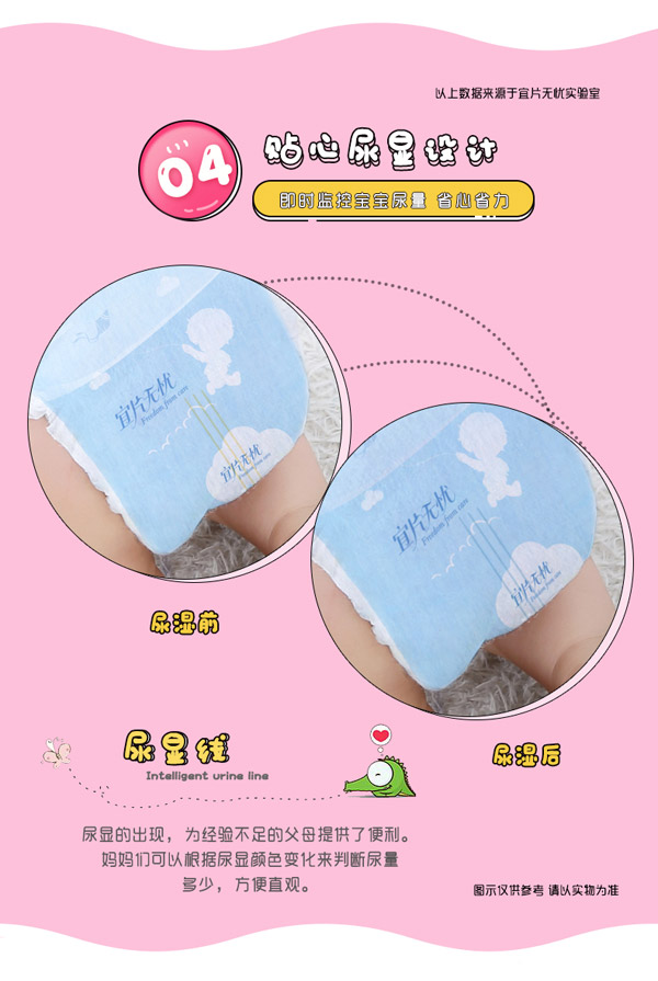 宜片無憂紙尿褲系列產品嚴格按照國家標準生產,生產制造過程實行全面質量管理,采用紫外線殺菌,產品長期經國家輕工業局紙張質量監督檢測泉州站和省防疫站檢驗,符合質量標準,衛生可靠,消費者可放心購買。