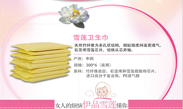 伊品雪蓮衛生巾,采用天然竹纖維、石墨烯雪蓮芯、進口高分子復合紙、PE透氣膜等為主要原料,天然竹纖維為多孔狀結構,相較綿柔網面更透氣,石墨烯雪蓮芯片,健康從“芯”開始。植物提取,清潔私處,吸水透氣,不含熒光劑,健康更安心。更有超強吸收力,不回滲,沒有異味,擺脫尷尬;粘黏力好,穩貼內褲補位移。每片均為獨立包裝,方便更衛生,超薄更舒適,有芯更貼心!