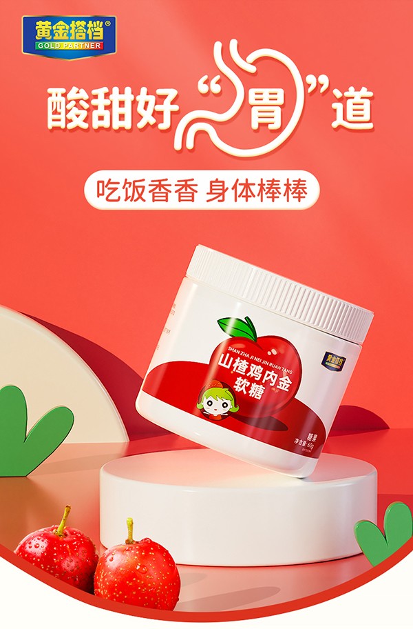 黃金搭檔山楂雞內金軟糖,植物草本配方,綠色安全!精選果實飽滿的優質山楂為原料,更添加雞內金提取物、維生素C等,科學配比,美味營養!以麥芽糖醇代替蔗糖,降低甜度,呵護幼齒!顆顆獨立包裝,干凈衛生易攜帶,拆袋即食,酸甜口感,拯救“小飯渣”,讓孩子“食”力全開,茁壯成長!