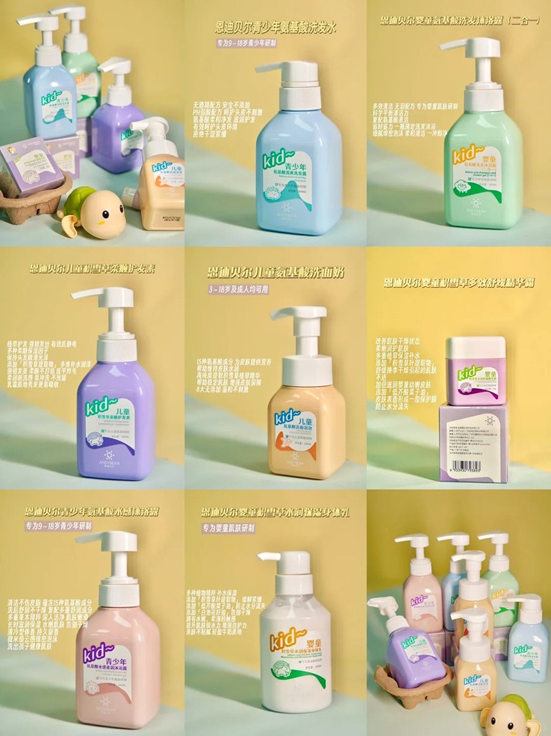 恩迪貝爾兒童洗護(hù)產(chǎn)品,涵蓋兒童積雪草氨基酸洗面奶、青少年積雪草氨基酸兒童洗發(fā)露、兒童積雪草氨基酸嬰兒洗沐二合一、積雪草多效舒緩精華霜、兒童積雪草柔順護(hù)發(fā)素、青少年積雪草氨基酸沐浴露、嬰童積雪草水潤(rùn)保濕身體乳等。