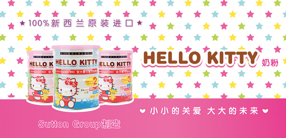HELLO KITTY嬰幼兒配方奶粉由日本三麗鷗公司(HELLO KITTY是旗下品牌之一)授權,新西蘭SUTTON GROUP公司生產,原罐原裝出口至中國。天然優質的奶源、風靡全球的品牌和科學嚴謹的工藝,成就HELLO KITTY嬰幼兒配方奶粉的一流品質和銷售佳績,為了讓更多的寶寶享受到HELLO KITTY細心呵護,現公司面向全國火爆招商。