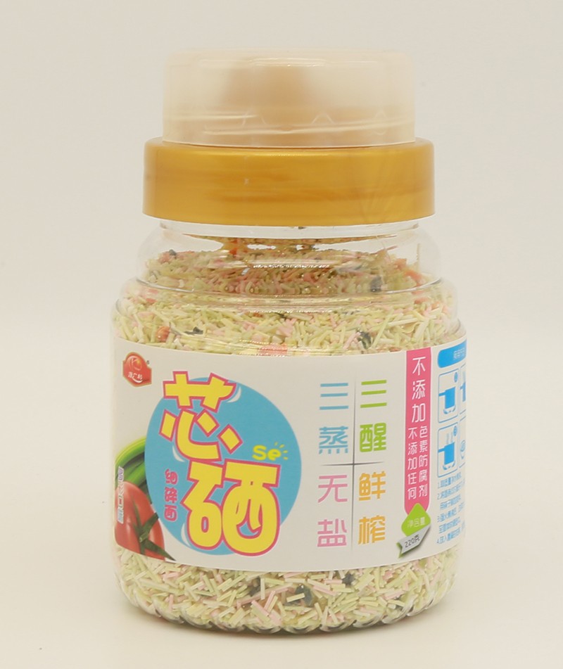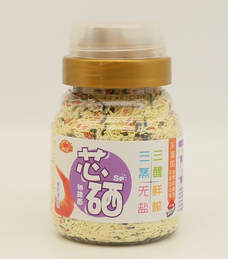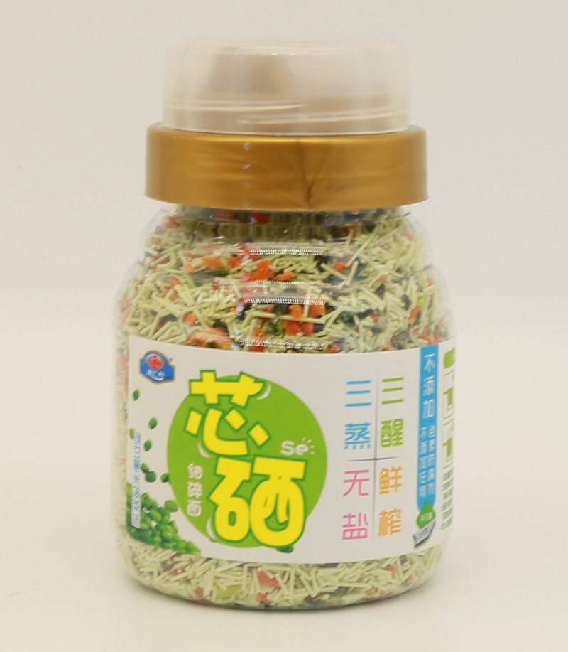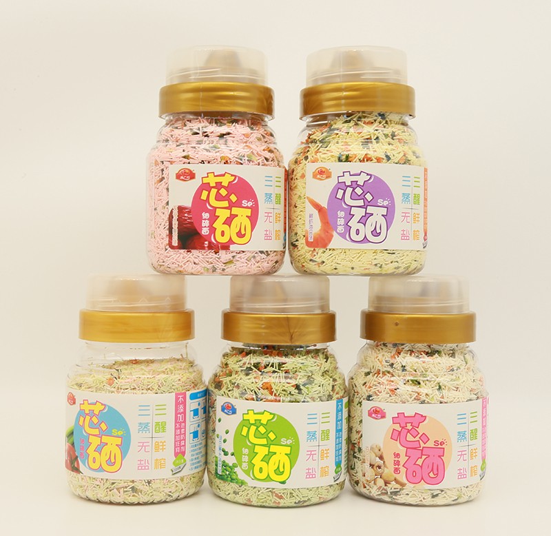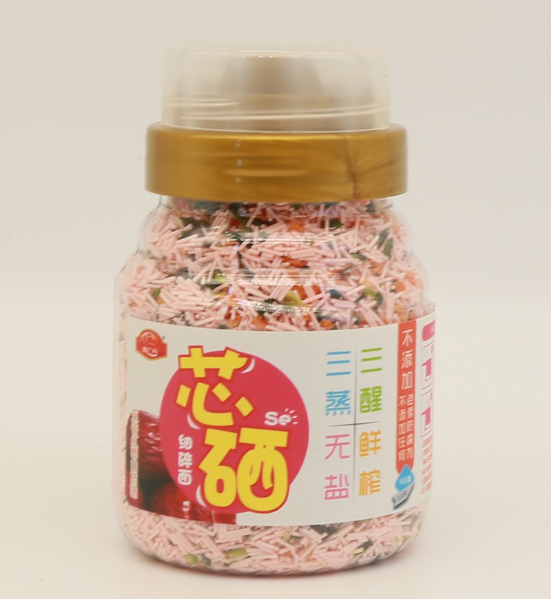 康廣利芯硒細碎面,采用麥芯粉、鮮榨蔬菜汁等優質食材制作,經獨特用心調制,淡淡的雜糧和蔬菜香味進入面條中,綠豆薏米菠菜味、五谷紅棗山藥味、鮮蝦海苔味、百合蓮子口味、多彩口味,多種不同口味,讓寶寶的味蕾開始旅行。三醒三蒸,無鹽鮮榨,不含色素、防腐劑、增白劑,健康安全。易煮不渾湯,造型獨特,面體爽滑,口感美味。罐裝設計,易于存儲,干凈衛生,食用方便。