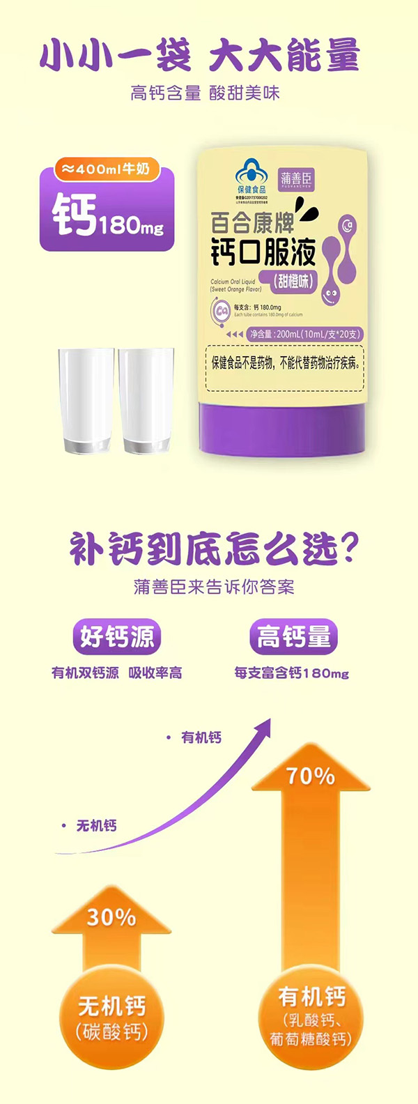 蒲善臣鈣口服液以其卓越的產品優勢贏得了廣泛認可。產品采用葡萄糖酸鈣與L-乳酸鈣雙鈣源配方,科學配比,更易吸收。每支口服液富含180mg鈣,小小一袋卻蘊含大大能量,滿足日常營養補充需求。同時,其酸甜美味的口感,深受消費者喜愛,尤其適合追求健康與美味兼具的現代家庭。